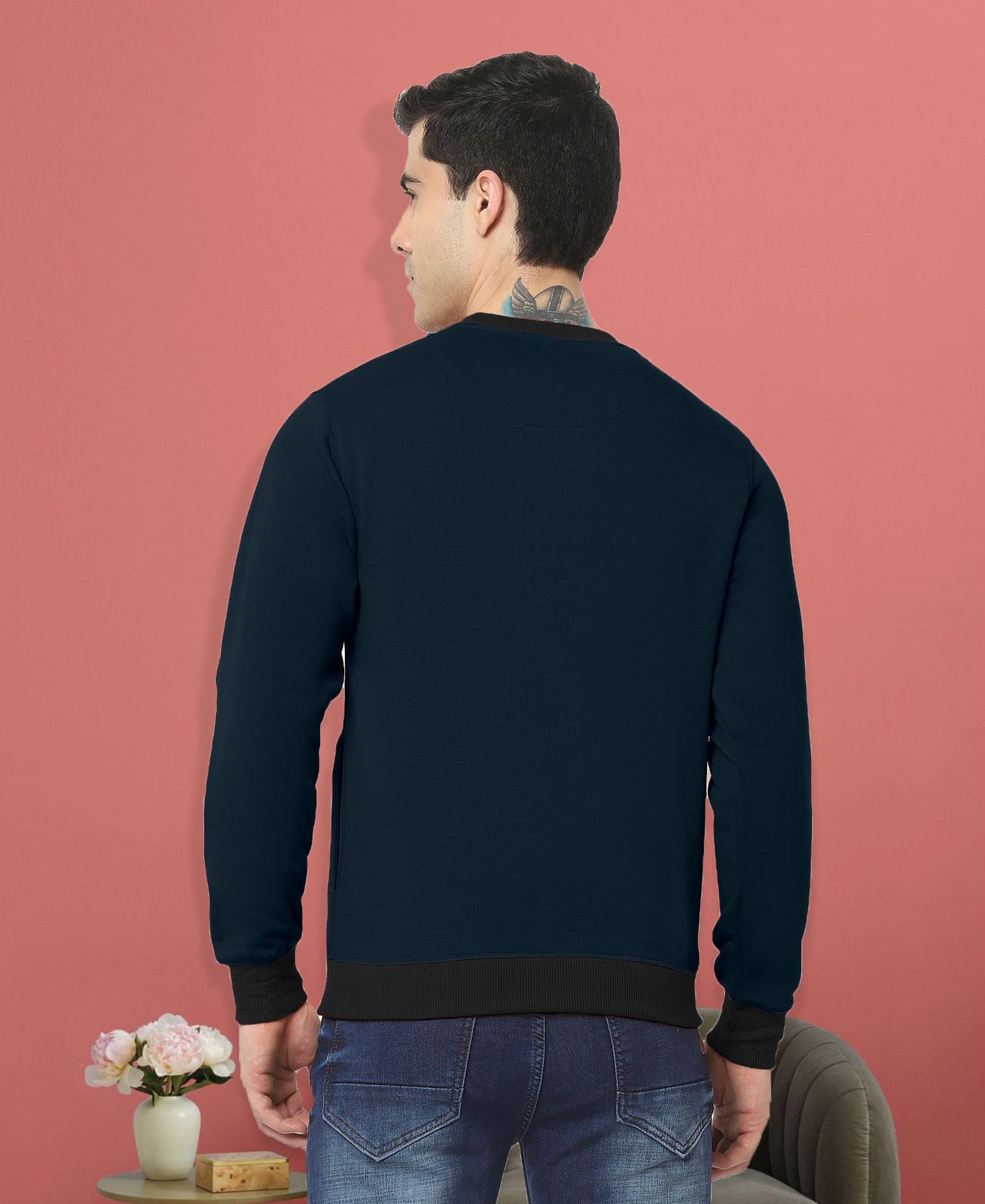 HiFlyers Men Slim Fit Cotrast Rib Cotton Fleece Round Neck Sweatshirt -Navy