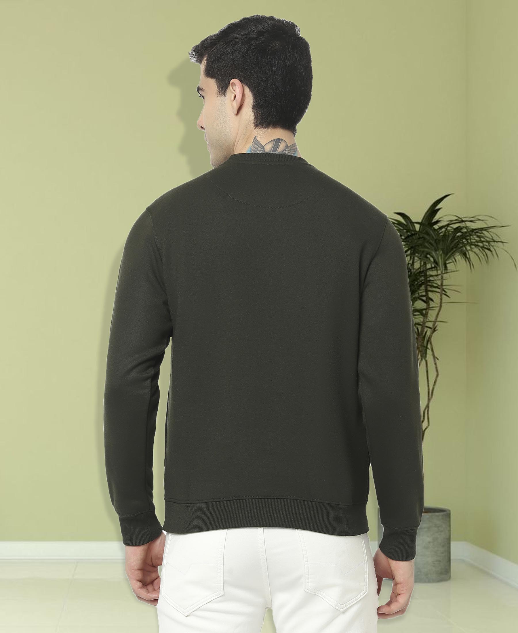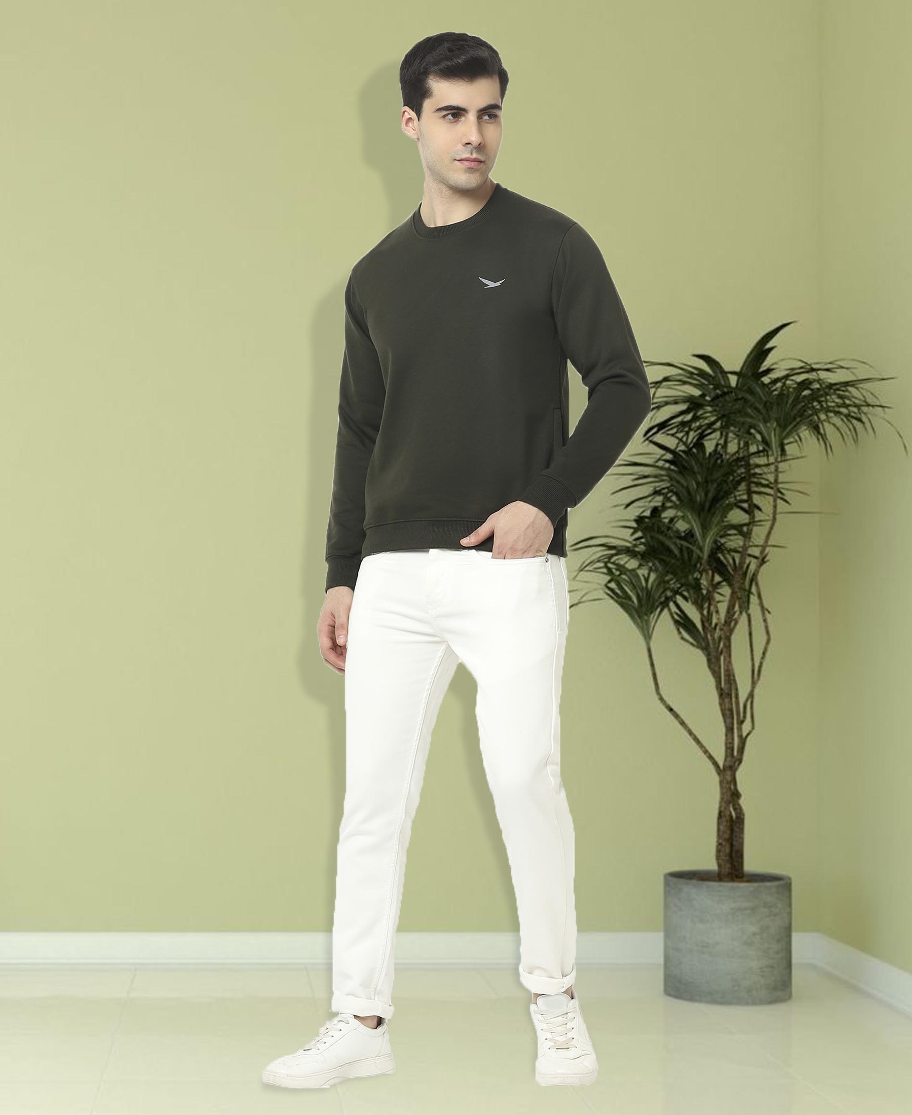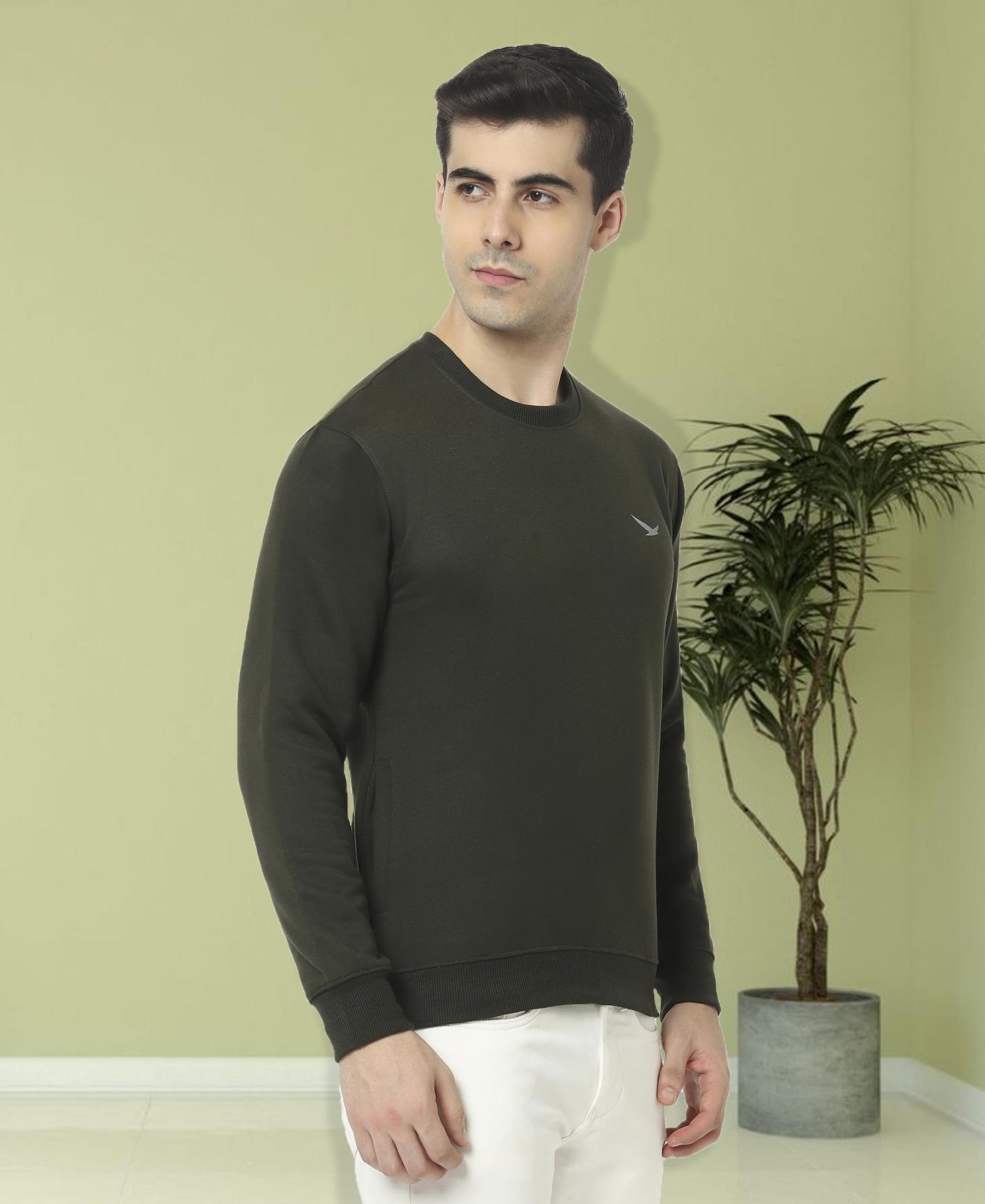 HiFlyers Mens Olive Slim Fit Solid Cotton Fleece Sweatshirt