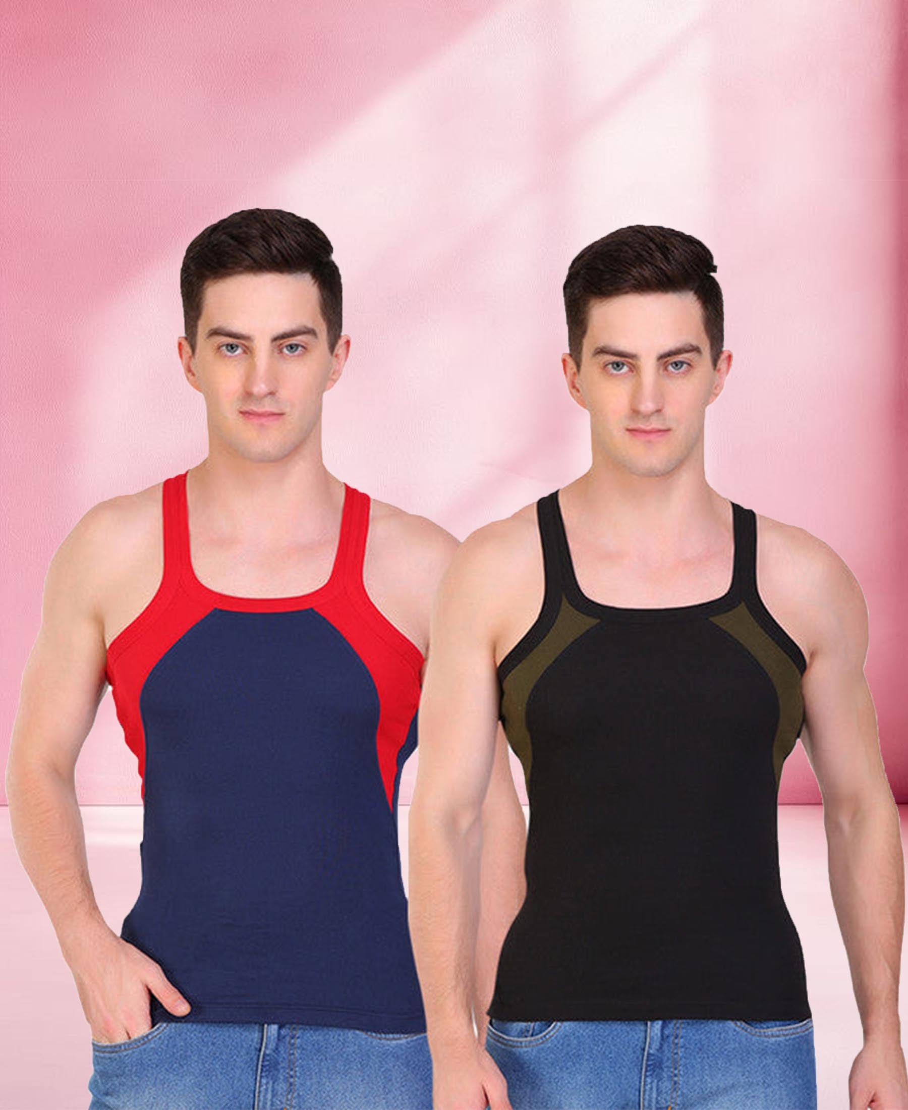 T.T. Men Designer Gym Vest Pack Of 2 Black-Olive -Blue-Red