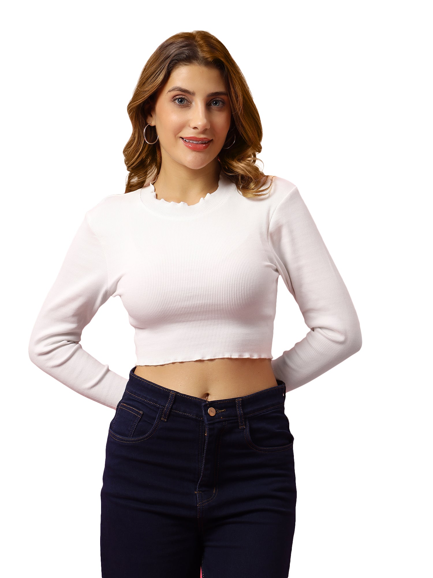 T.T. Women|Slim Fit Ribbed Top|Stretchable Cotton Rib Fabric| Trendy High Street Casual & Office Wear Full Sleeve Crop Tee|Desire Rib Tshirt For Women||White