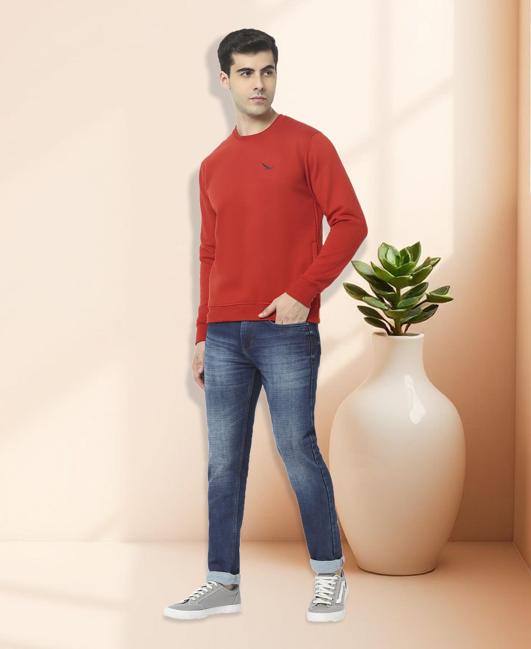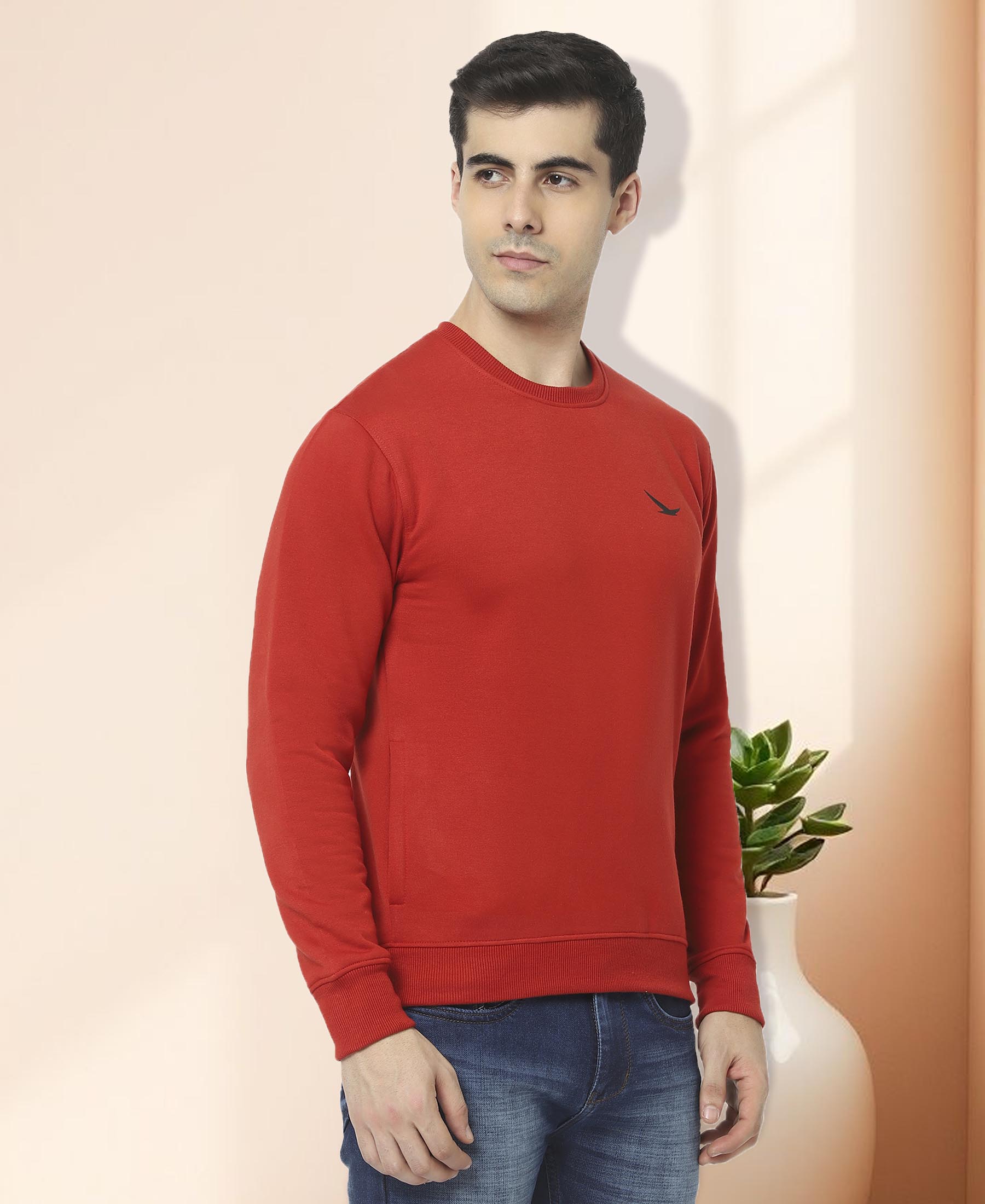 HiFlyers Mens Red Slim Fit Solid Cotton Fleece Sweatshirt