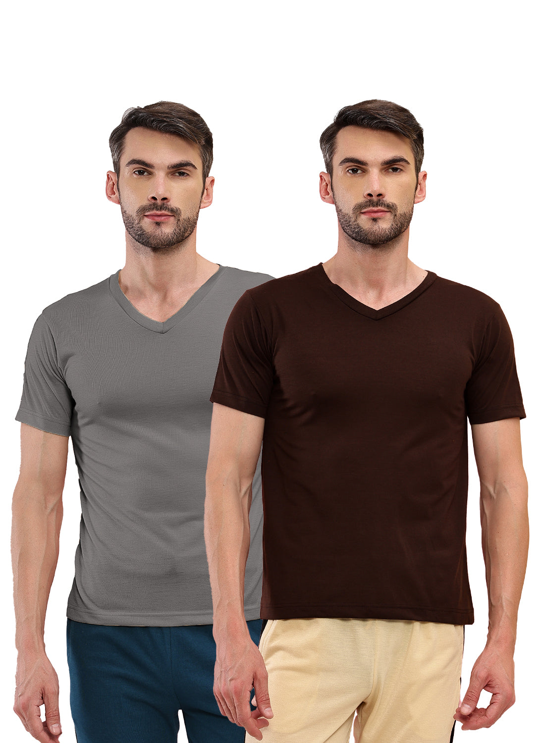 T.T. Men Slim Fit Poly Jersey V-Neck Half Sleeve T-Shirt Pack Of 2 Anthra-Maroon
