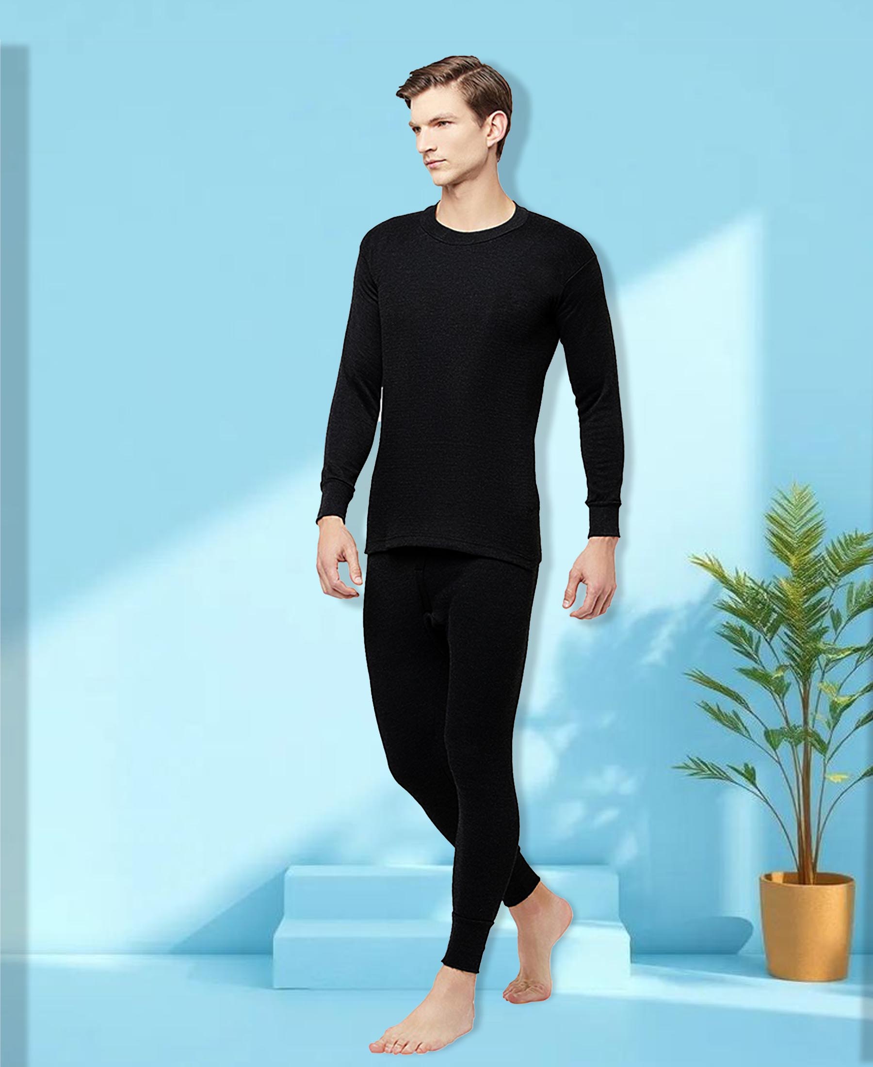 T.T. Men Regular Fit Hotpot Dyed Cotton Fleece Heavy Winter Thermal Top -Black