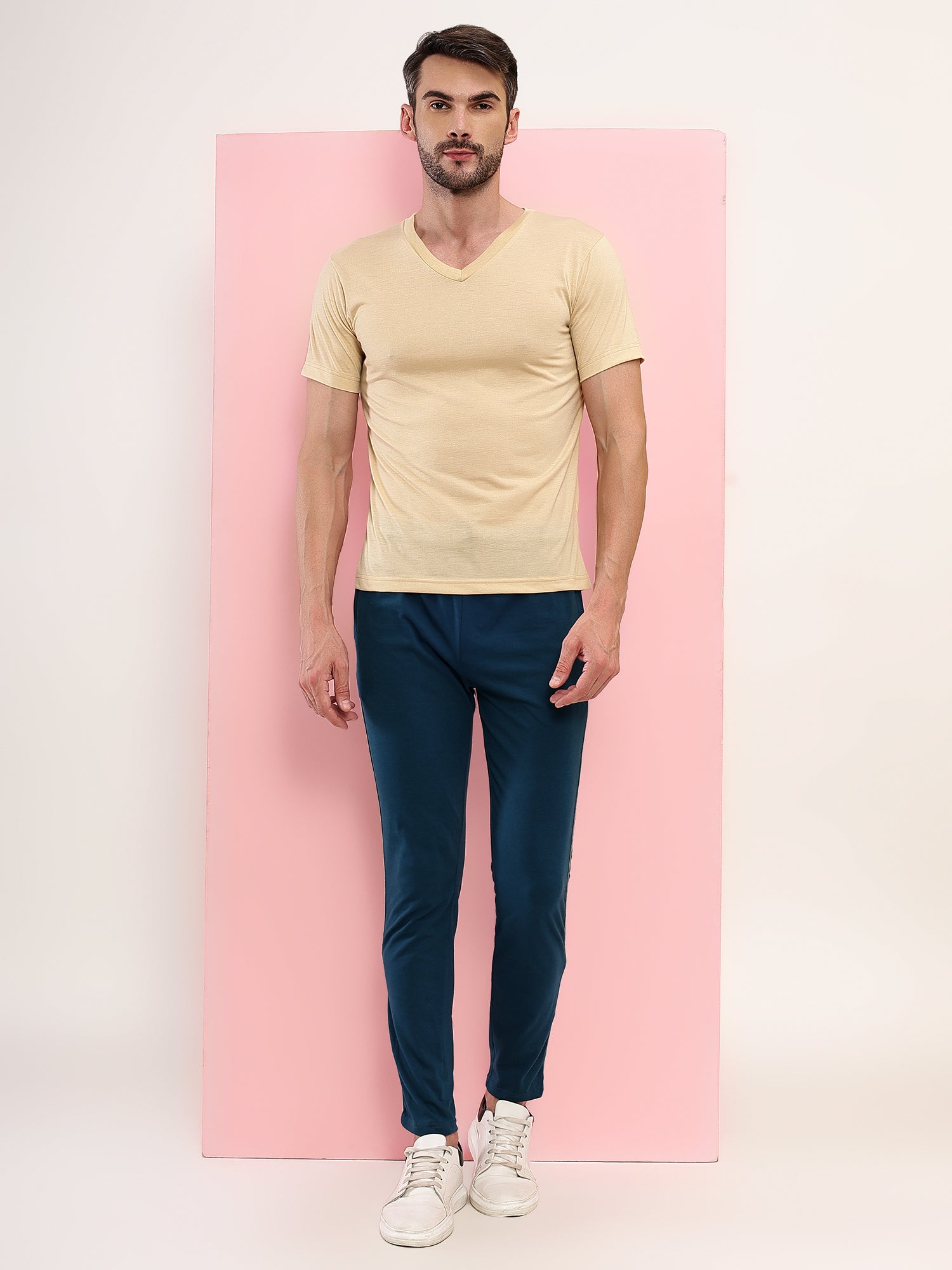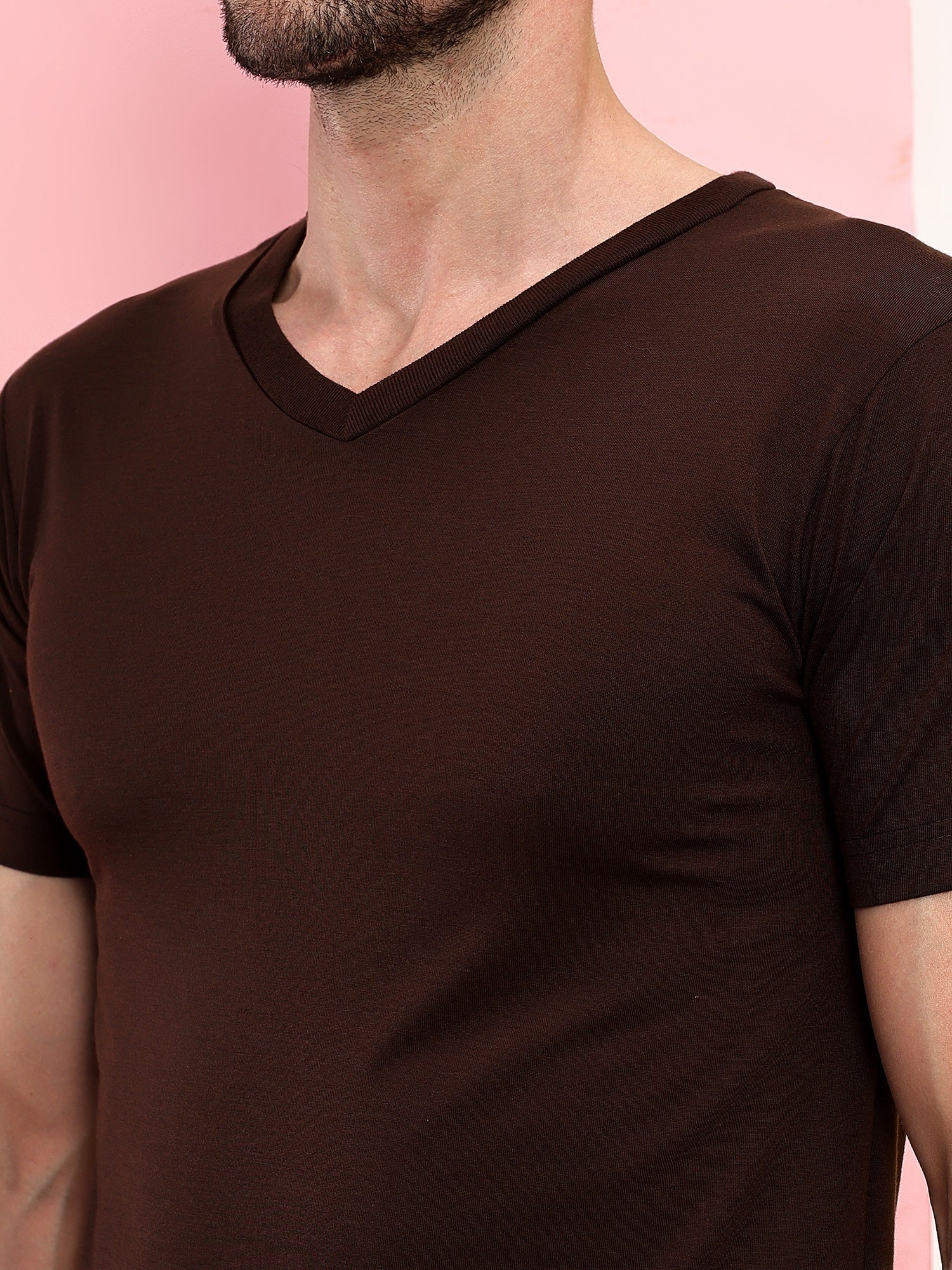 T.T. Men Slim Fit Poly Jersey V-Neck Half Sleeve T-Shirt Pack Of 2 Brown-Skin