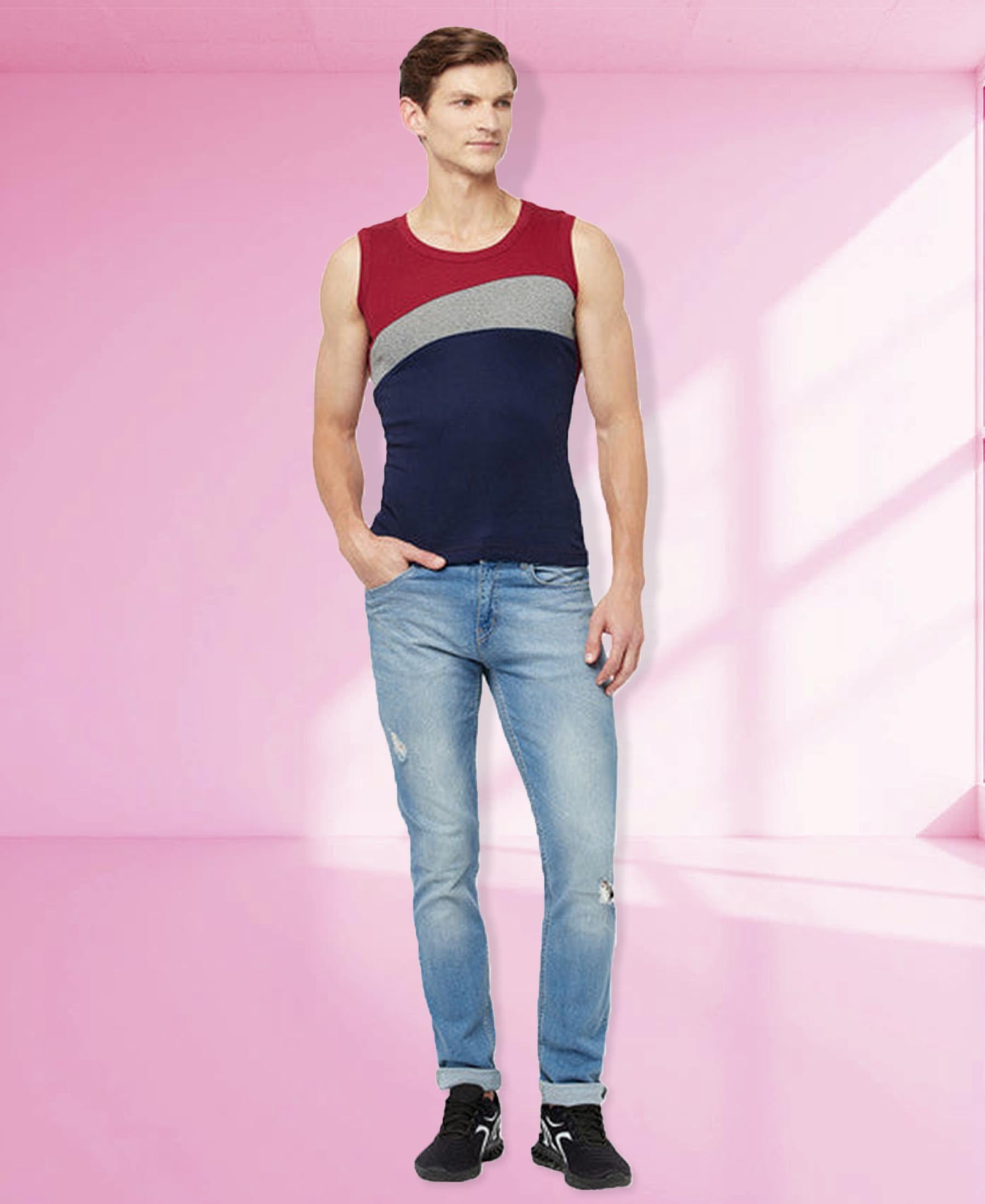 T.T. Men Designer Gym Vest Pack Of 2 Red-Blk-Navy-Grey