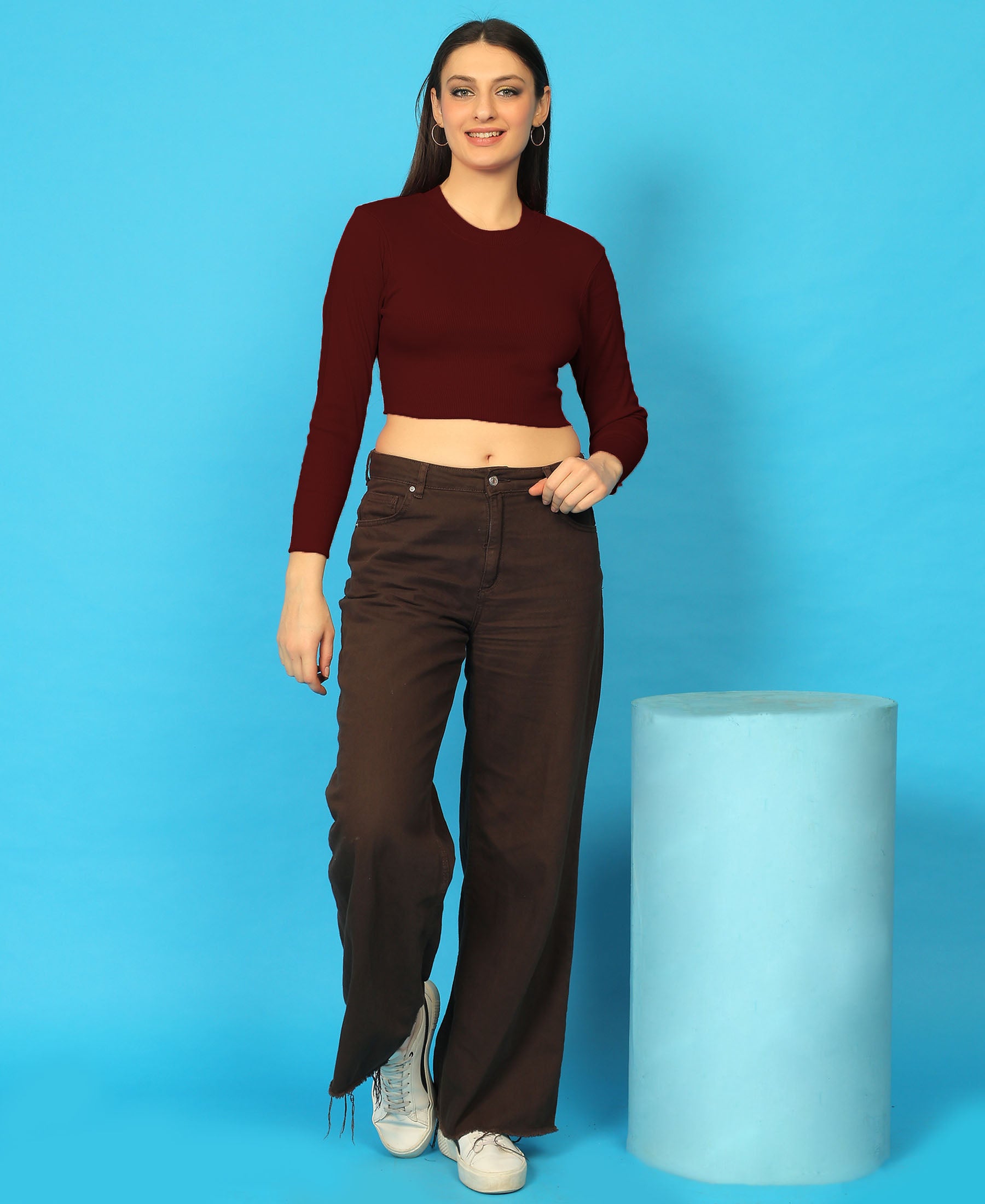 T.T. Women|Stylish Crop Top|Ribbed Slim Fit Full Sleeve Round Neck Trendy Casual Wear Top|Stretchable Cotton Fabric|Tshirt|Top||Maroon