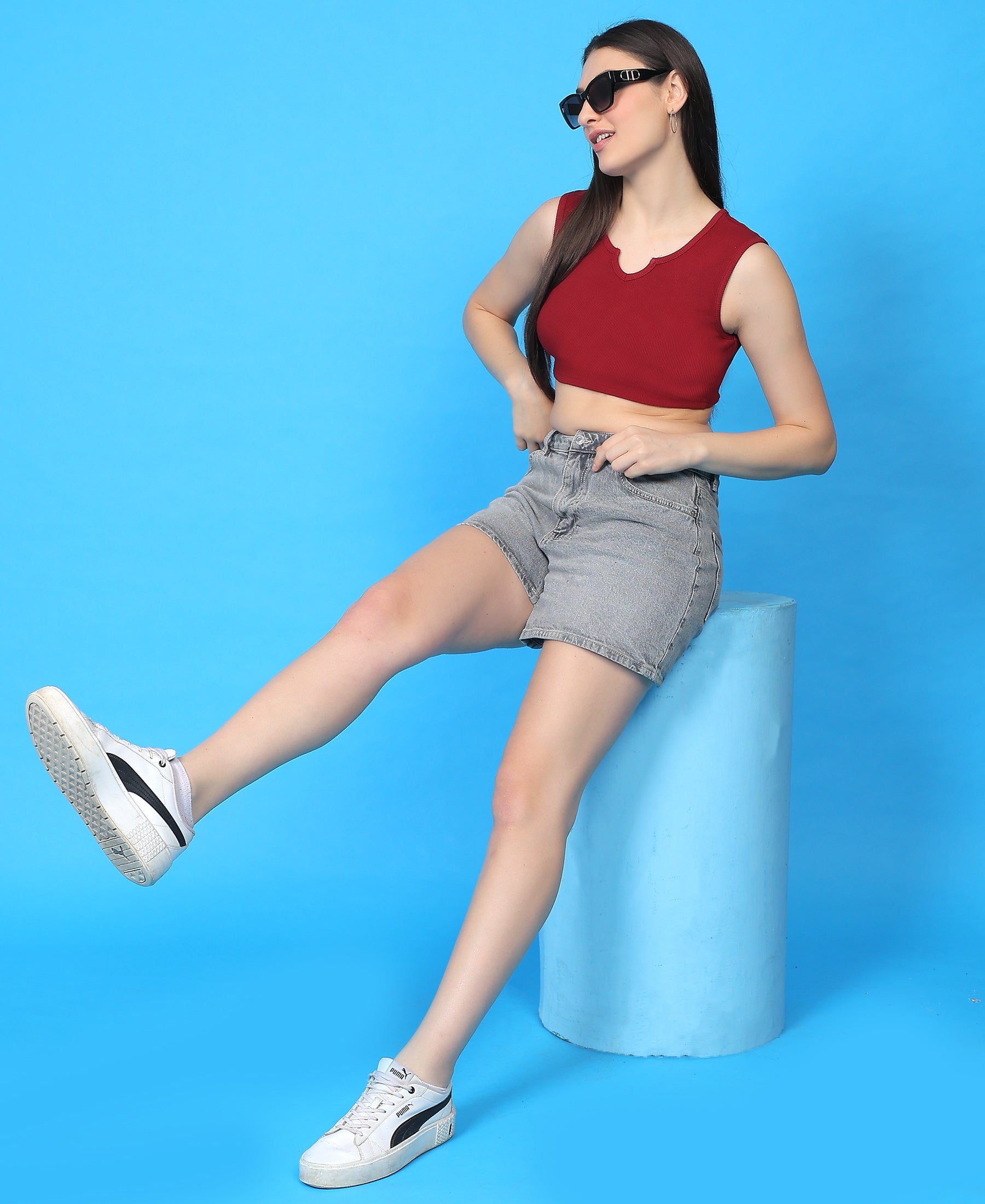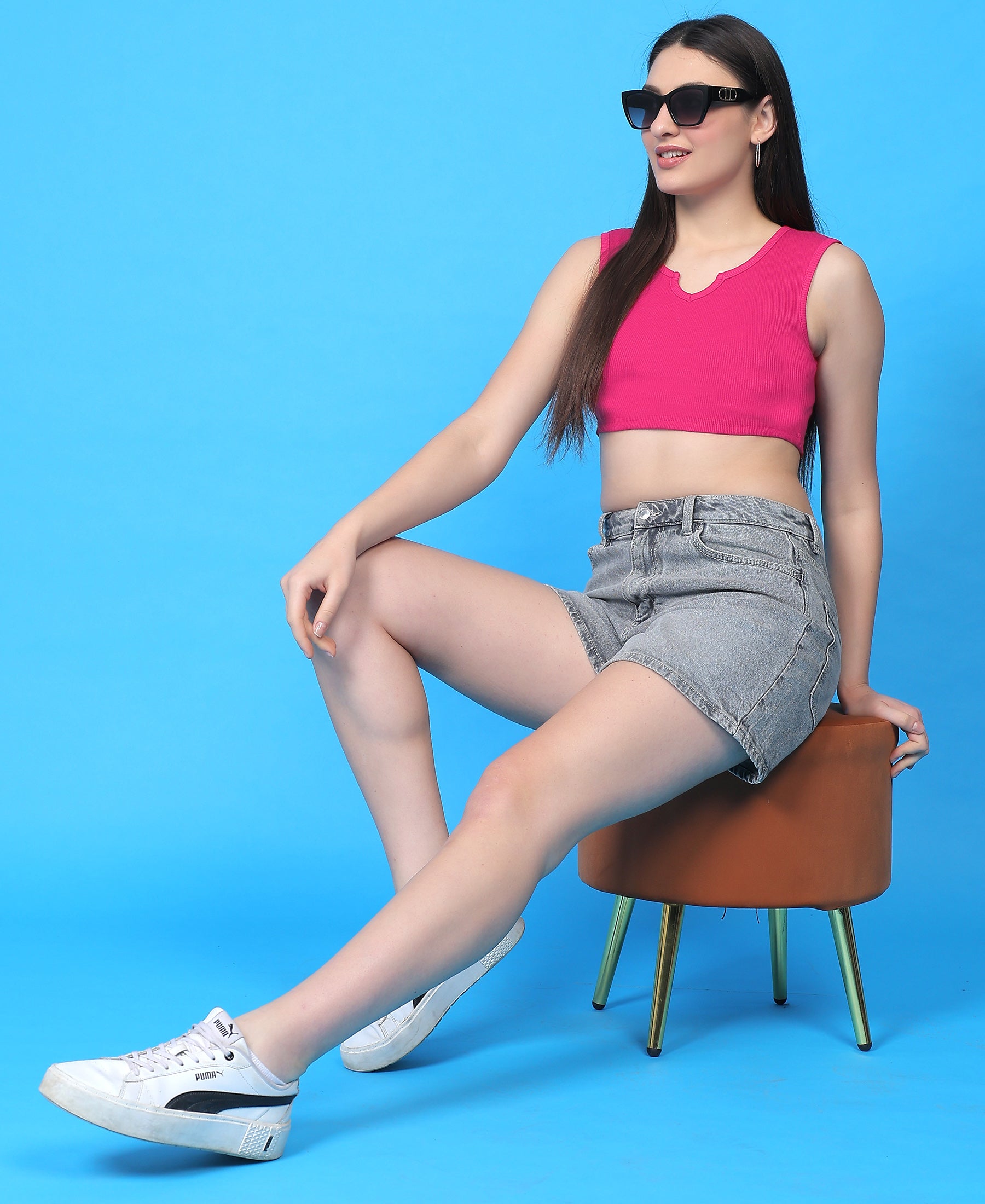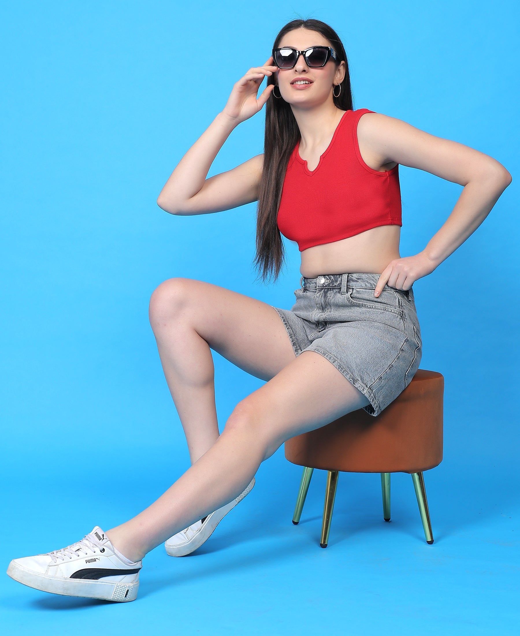 Turn heads with this Ribbed crop top for women designed for bold, confident style. With its sleeveless design and trendy notch neckline, this top delivers the perfect mix of comfort and Gen Z fashion.
