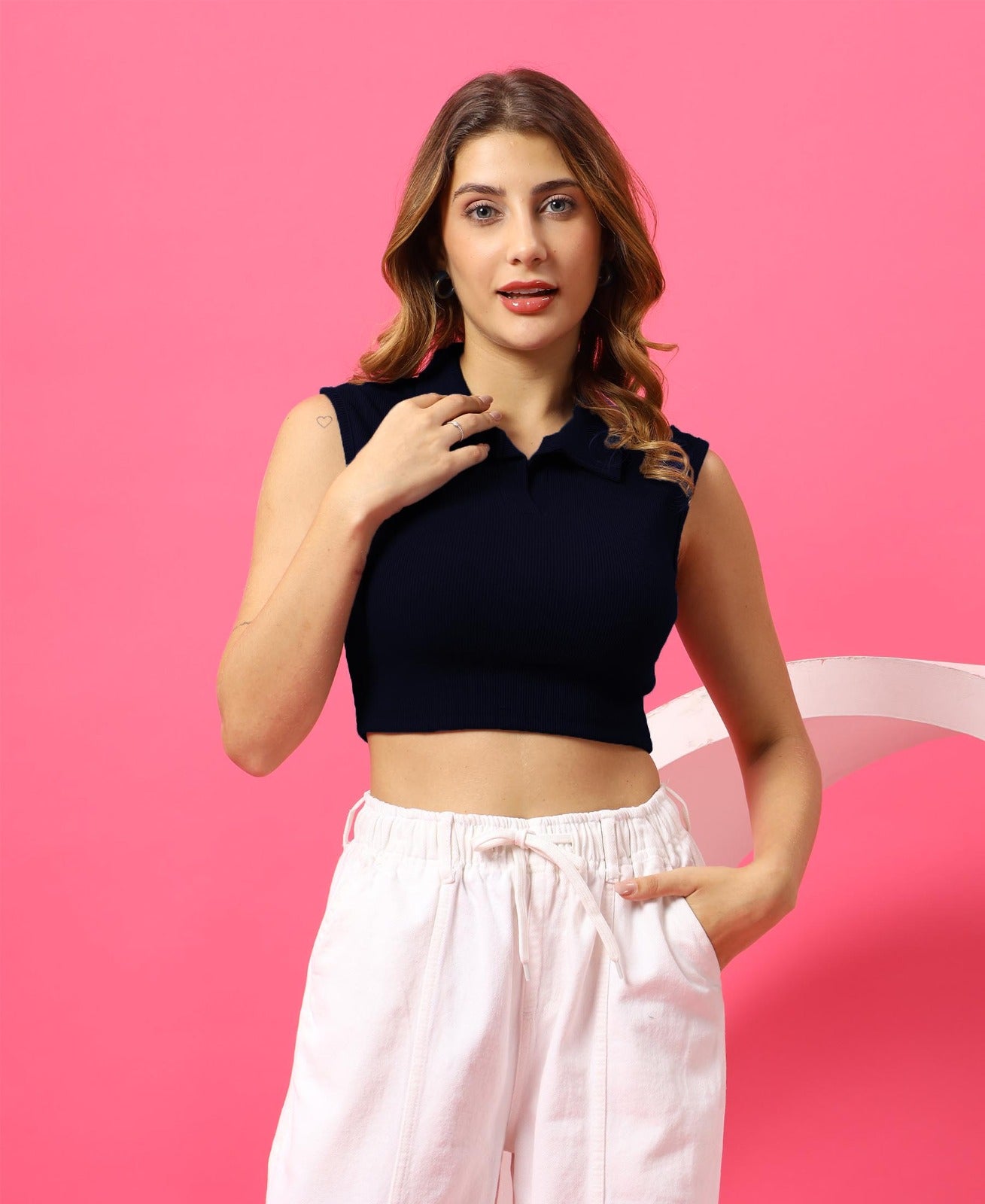 Whether you’re heading to the office, college, or a casual day out, this sleeveless polo neck crop top blends effortlessly with your look. Its minimal yet stylish design adds a high-street fashion vibe, making it a must-have essential in every modern woman’s wardrobe.